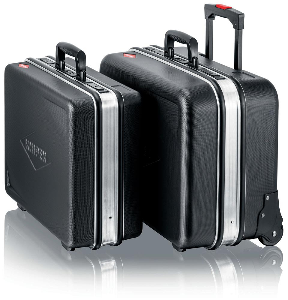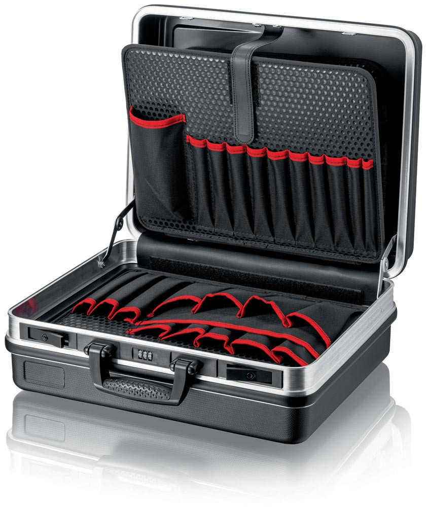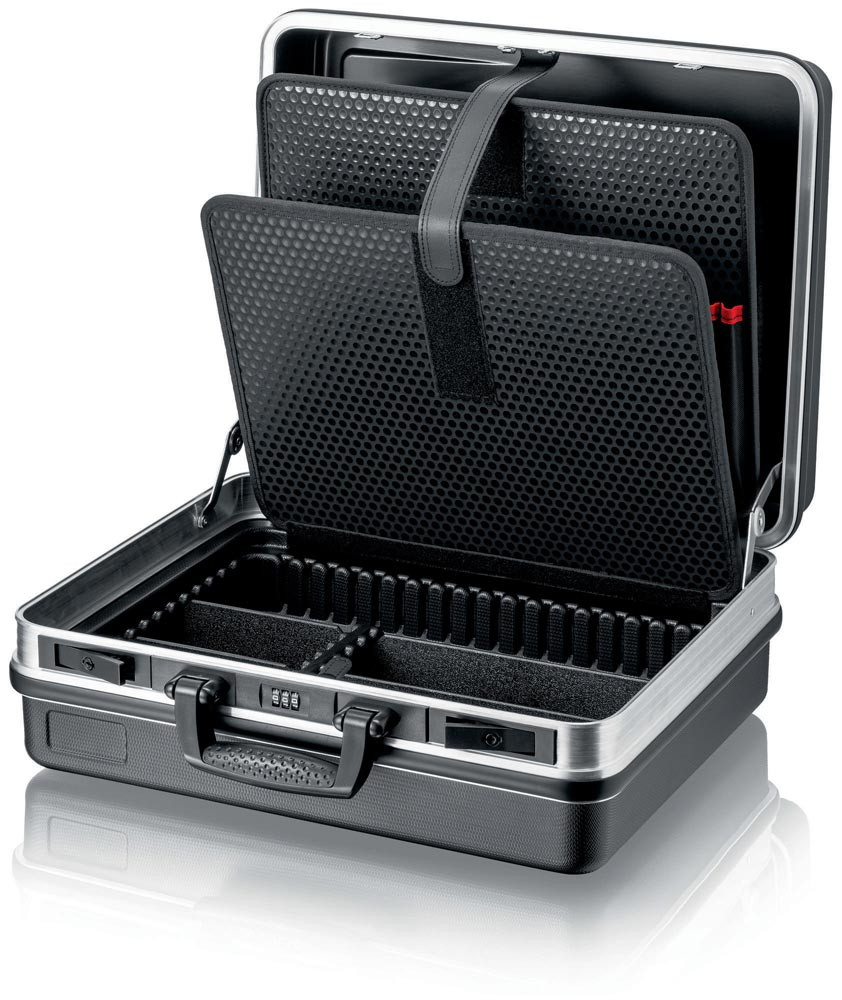 strapazierfähige Ausführung aus ABS-Material, schwarz · umlaufender Aluminiumrahmen · 3-stelliges Zahlenschloss und 2 Kippschlösser zur Fixierung das Deckels · stabiler, ergonomischer Tragegriff · Metallscharniere · Deckelhalter mit Scharniermechanik · Dokumentenfach im Deckel · herausnehmbare Werkzeugtafel im Deckel mit 9 Werkzeugtaschen und einer elastischen Schlaufe auf der Deckelseite und 10 schmalen und einer großen Werkzeugtasche auf der Bodenseite · Bodenschale, Höhe 55 mm, durch Einsätze weiter unterteilbar und Abdecktafel mit 12 großen Werkzeugtaschen und ein Flachfach · per Druckknopf fixierbar · Belastbarkeit 15 kg