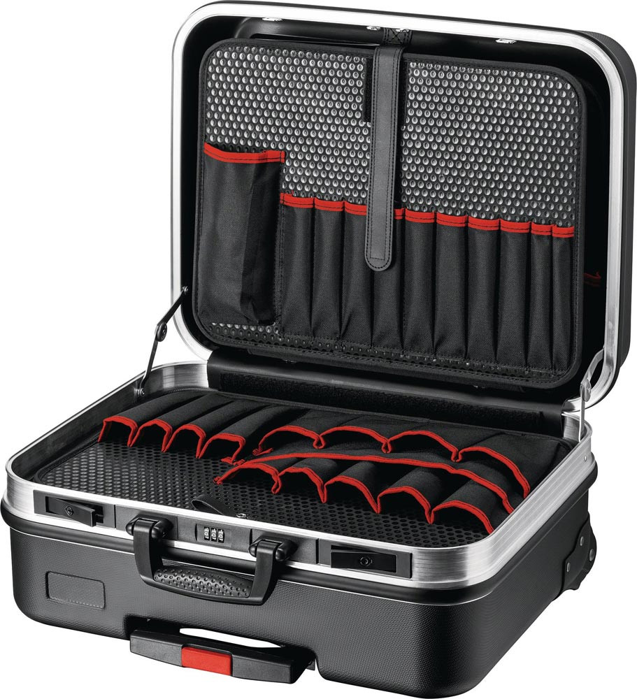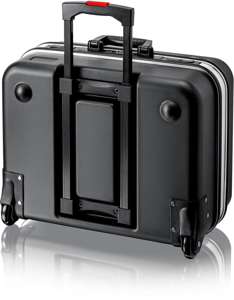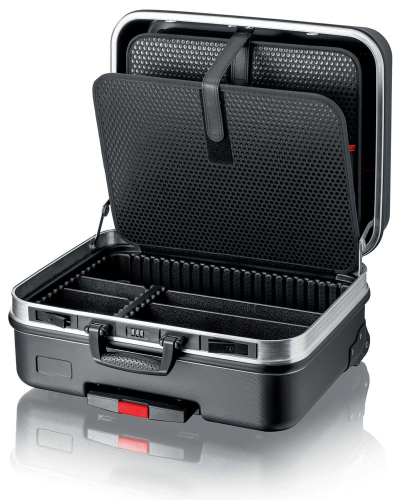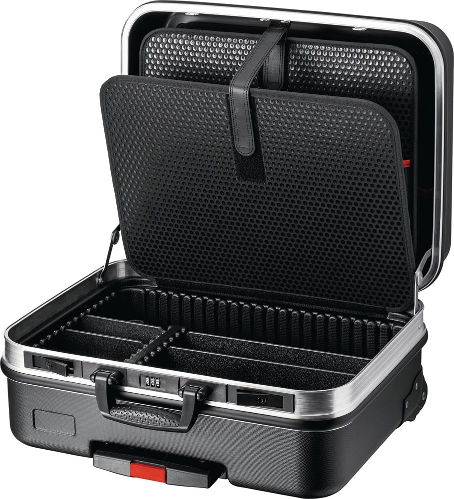 mit Trolly-Funktion · variable Bestückungsmöglichkeit · mit Bodenschale, Abdeckplatte, Dokumentenfach und Deckelhalter, 2 herausnehmbare Werkzeugtafeln aus schmutzabweisenden PP, Hohlkammerplatten mit 21 bestückbaren Separationen · aus ABS-Material mit umlaufendem Alu-Rahmen, Metallscharnieren und handfreundlichem Griff · Belastbarkeit bis zu 20 kg