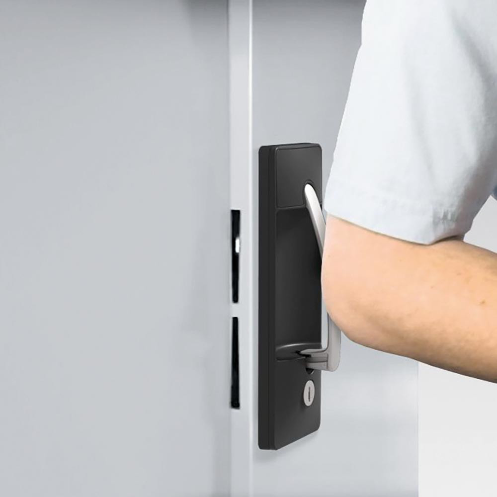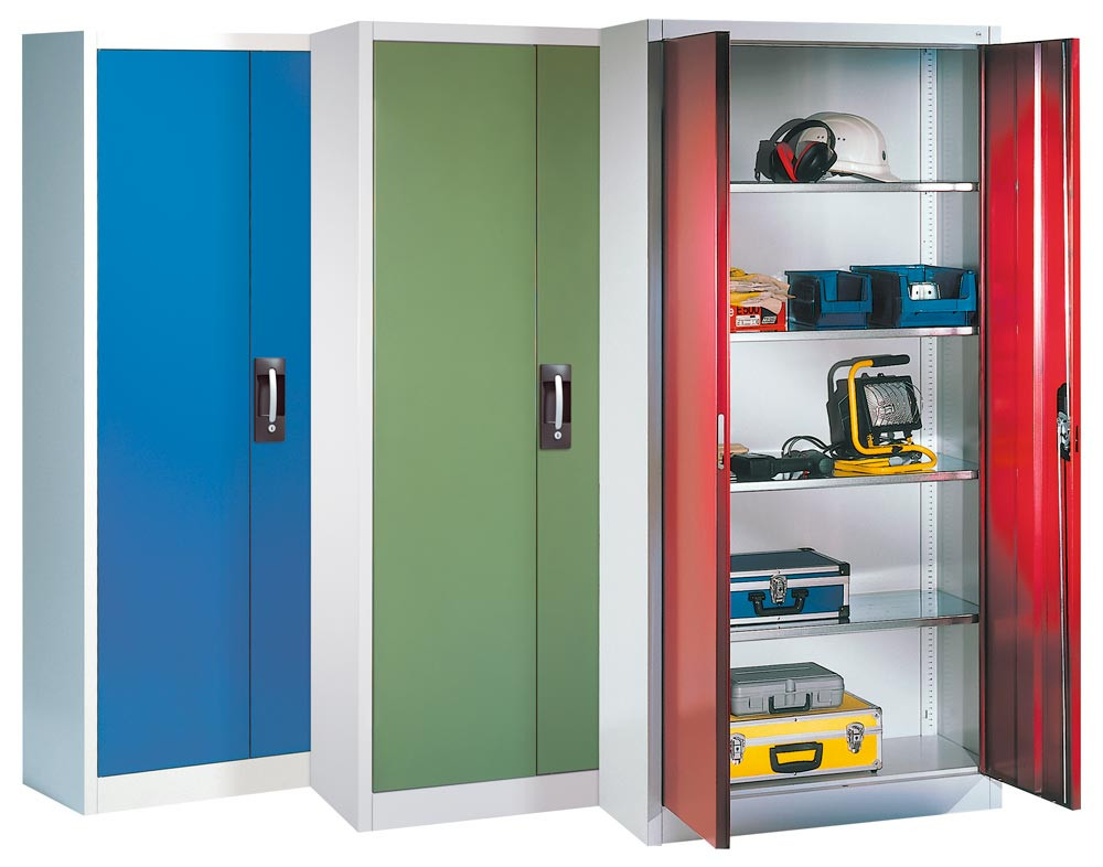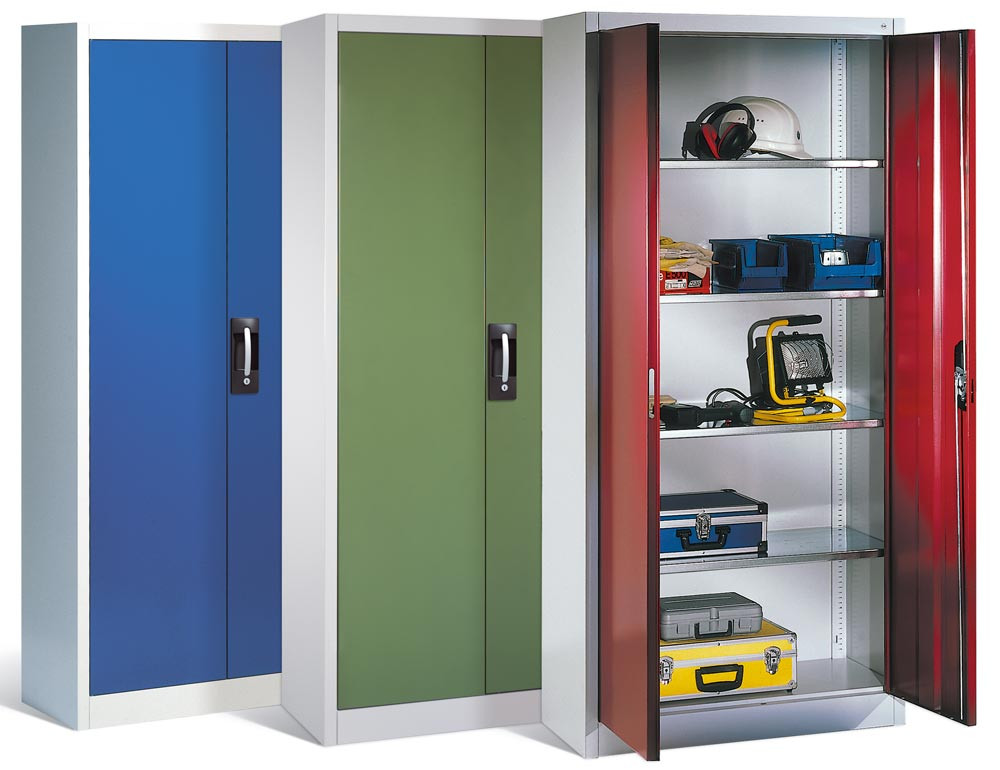 · Stabile Stahlblechkonstruktion mit hochwertiger Einbrennbeschichtung · Schränke mit gemeinsam verschließbaren Flügeltüren mit Verstärkungsprofil · 3-riegeliges Griffschloss