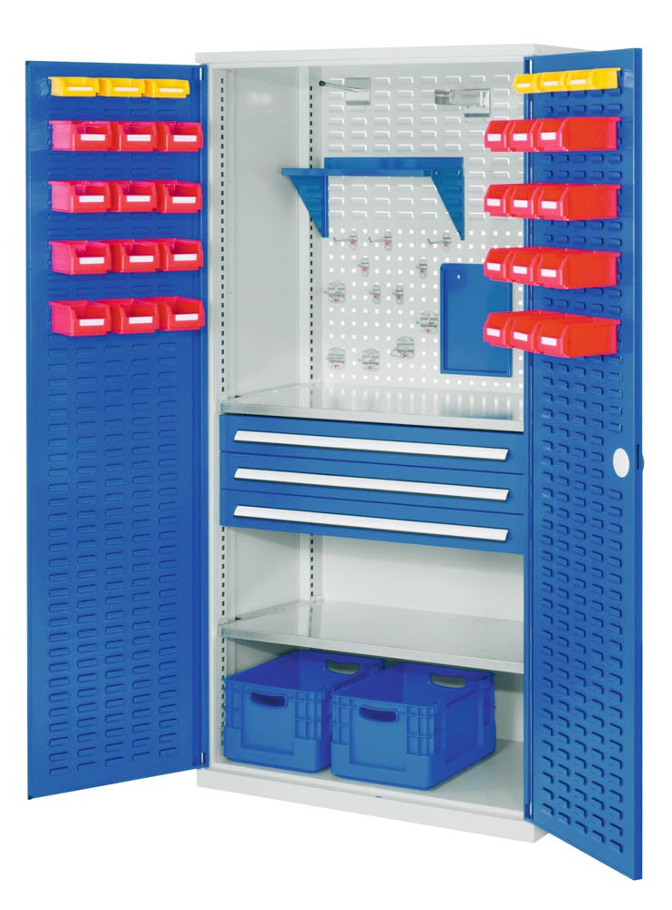 ∙ Korpus aus geschweißtem Stahlblech, wahlweise in 2 Farbvarianten kunststoffbeschichtet ∙ Mit Lochraster und Schlitzprägung in der Rückwand ∙ Aufschlagende, doppelwandige Flügeltüren, Öffnungswinkel > 200°, Tür mit Loch- oder Schlitzplatten oder Sichtfenster ∙ Dreiriegeliges Sicherheits-Zylinderschloss mit versenktem Drehgriff ∙ Verzinkte Fachböden im Raster von 25 mm höhenverstellbar, Traglast 80 kg (bei gleichmäßig verteilter Last) ∙ Teleskopgeführte Schubladen mit Vollauszug, Traglast 110 kg (bei gleichmäßig verteilter Last), im Raster von 25 mm höhenverstellbar