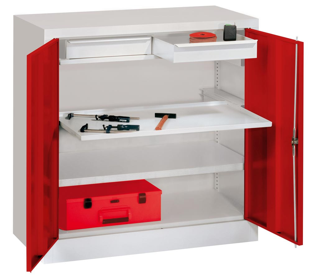 Werkzeugschrank, Vollblechtüren, 1 beschichteter Boden, 1 Auszugboden, 2 Schubl. 75 mm, BxTxH 1000x500x1000 mm, RAL 7035/3000