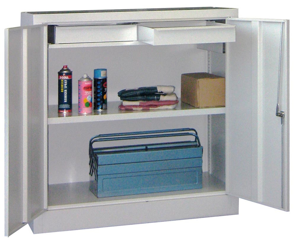 Werkzeugschrank, Vollblechtüren, 1 beschichteter Boden, 2 Schubladen 75 mm, BxTxH 1000x500x1000 mm, RAL 7035