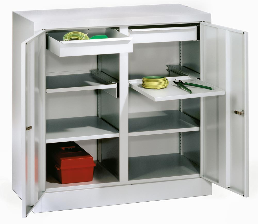 Werkzeugschrank, Vollblechtüren, einz. abschl.bar, Mitteltrennwand, 2 Böden, 2 Schubl. 75 mm, BxTxH 1000x500x1000 mm, RAL 5010 E873681