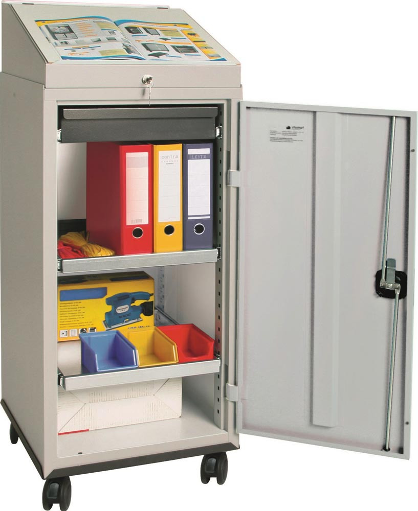 Stahlblechkonstruktion mit widerstandsfähiger Pulverbeschichtung · bestehend aus 1 Werkzeugschrank H 1000 x B 500 x T 500 mm mit 1 Schublade H 100 mm und 2 Fachböden, mit allseitigem Rand, Höhe 30 mm (lt. UVV nicht ausziehbar) · Schreibpultaufsatz mit abschließbarerem Deckel · Rollenuntersatz mit 4 Lenkrollen Ø 75 mm, Tragfähigkeit 75 kg pro Rolle · Schubladen, H 100 mm und Fachböden im 25-mm-Raster höhenverstellbar · Tragfähigkeit pro Fachboden/Schublade 35 kg · Flügeltür abschließbar mit Zylinderschloss und Drehriegelverschluss mit 3-Punkt-Verriegelung