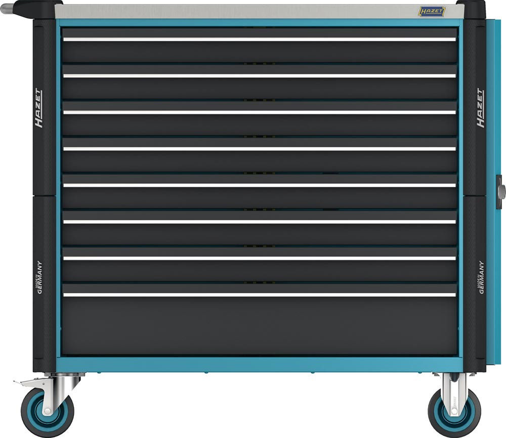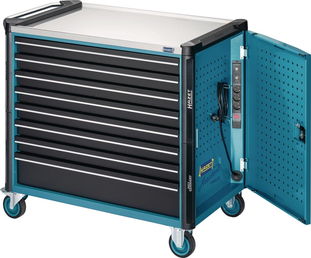 extra tiefe Ausführung · mit setilicher Tür und Steckdosenleiste · Edelstahl Arbeitsfläche · doppelwandige Konstruktion · Kantenschutz an allen vier Ecken · seitliche Schlossposition zur besseren Bedienbarkeit · Zentralverriegelung · Selbsteinzug der Schubladen · gegenseitige Auszugssperre für minimales Kipprisiko ·100% Auszug mit kugelgelagerten Teleskopschienen · 40 kg Traglast pro Schublade · Gesamttragkraft statisch 1000 kg · 2 Lenkrollen mit Doppelstopp · Elastikrollen für ruhigen Lauf