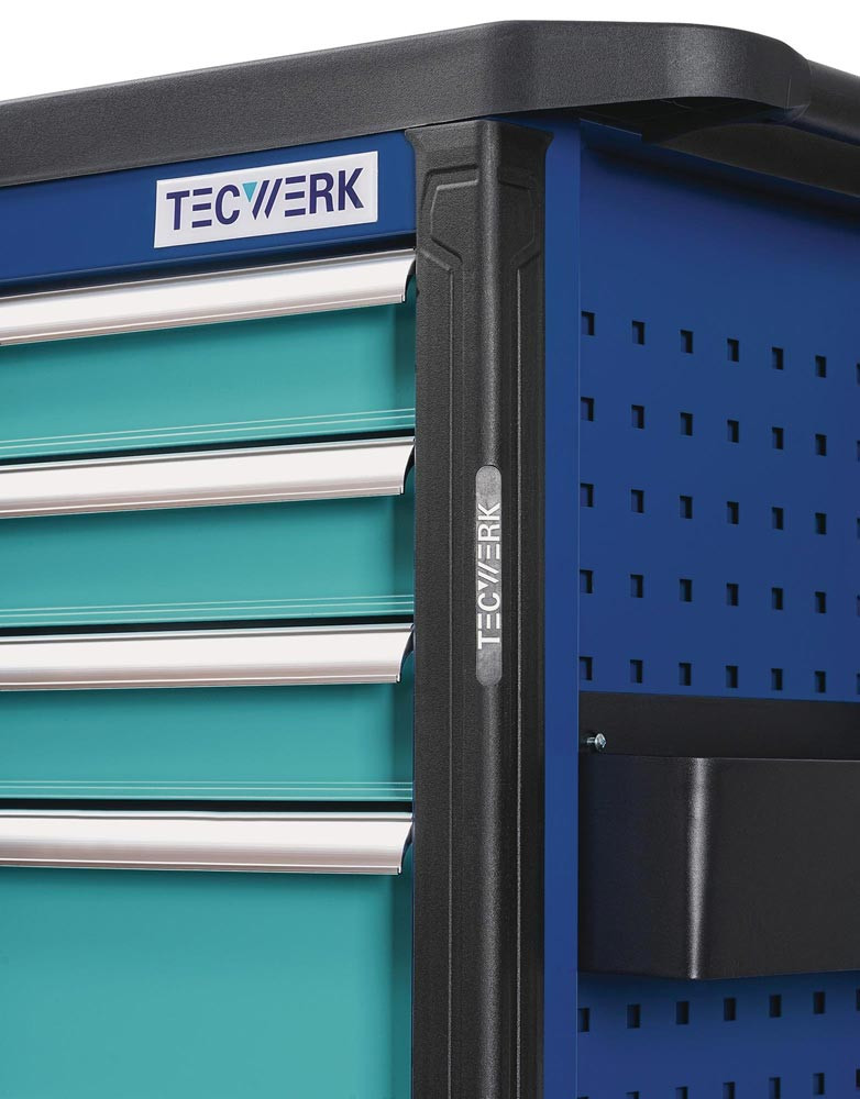 komplett mit 96-teiligem Werkzeugsortiment · mit 6 Schubladen · Handgriff · kugelgelagerte, mit Teleskopschienen herausziehbare Schubladen mit 100 % Auszug mit jeweils einer Antirutschmatte · automatischer Schubladeneinzug · Einteilerset für 4 Schubladen im Lieferumfang enthalten · mit Zentralverriegelung (nur eine Schublade gleichzeitig geöffnet) · abschließbar mittels eingebauten Zylinderschloss mit 4 Schlüsseln · beschriftbare Schubladen · Kunststoffabdeckung · hochwertige PVC-Rollen Ø 127 mm– 2 starre und 2 lenkbare Rollen mit Feststellung · beidseitiges Lochwandsystem (9 x 9 mm) für einfache Installation von Zubehörartikel · 2 Dosenhalter mit Lochung für Schraubendreher (im Lieferumfang enthalten) · durchgehender seitlicher Kantenschutz