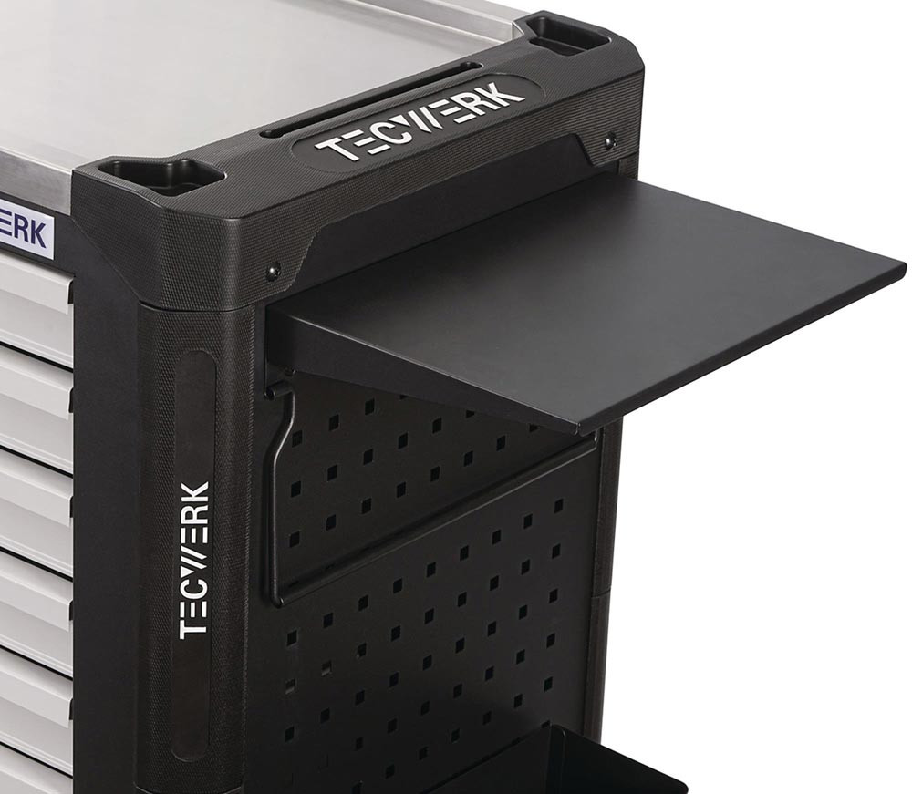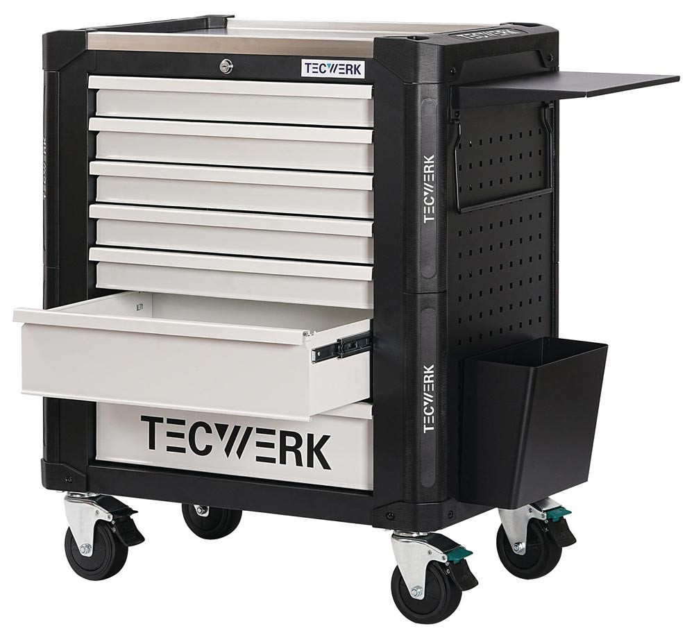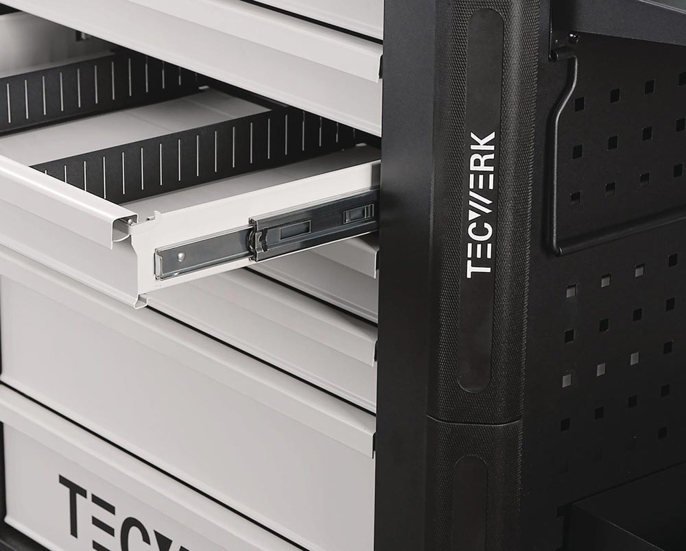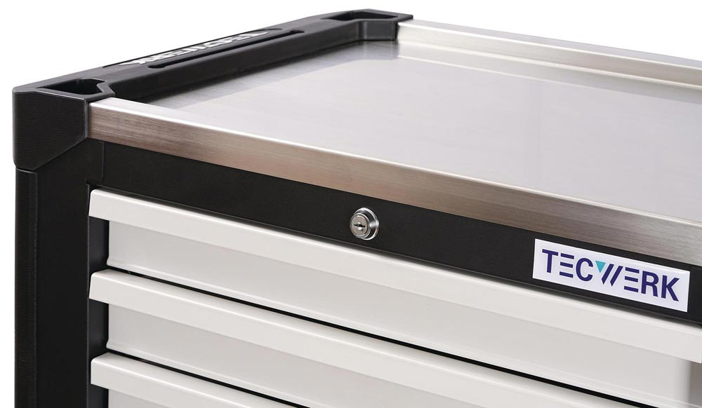 mit 7 Schubladen · Handgriff · kugelgelagerte, mit Teleskopschienen herausziehbare Schubladen mit 100 % Auszug mit jeweils einer Antirutschmatte · automatischer Schubladeneinzug · Schubladen mit "Lift to open" Funktion, verhindert selbstständiges Öffnen der Schubladen · mit Zentralverriegelung (nur eine Schublade kann gleichzeitig geöffnet werden) · Einteilerset für 4 Schubladen im Lieferumfang enthalten · abschließbar mittels eingebauten Zylinderschloss mit 4 Schlüsseln · beidseitiges Lochwandsystem (9 x 9 mm) für einfache Installation von Zubehörartikel · hochwertige PVC Rollen · 4 lenkbare Rollen · 2 inkl. Bremsfunktion · Edelstahl Ablagefläche · durchgehender seitlicher Kantenschutz