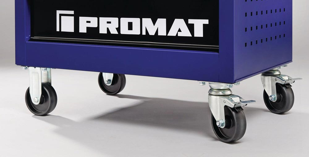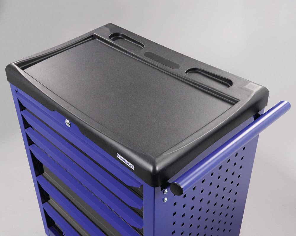 mit 6 Schubladen · kugelgelagerte, mit Teleskopschienen herausziehbare Schubladen mit 100 % Auszug mit jeweils einer Antirutschmatte · automatischer Schubladeneinzug · Einteilerset für 4 Schubladen im Lieferumfang enthalten · abschließbar mittels eingebauten Zylinderschloss mit 2 Schlüsseln · hochwertige PVC-Rollen – 2 starre und 2 lenkbare Rollen mit Feststellung · beidseitiges Lochwandsystem (9 x 9 mm) für einfache Installation von Zubehörartikeln