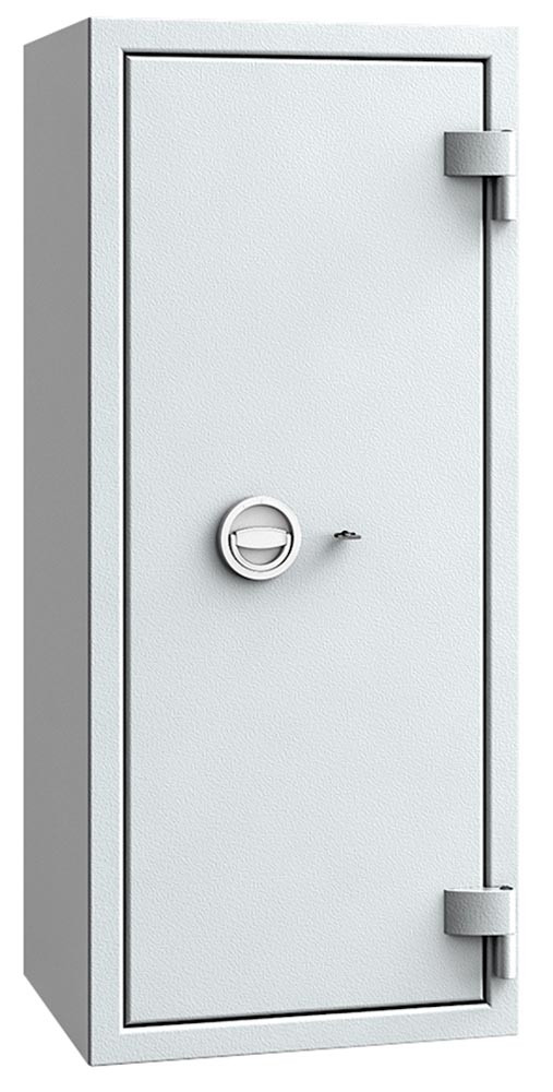 ∙ Leichte Ausführung mit Widerstandsgrad I nach EN 1143-1, ECB*S zertifiziert ∙ Hoher Einbruchschutz durch allseitig mehrwandigen Korpus und mehrwandige Tür, 80 mm stark ∙ Verankerung durch eine Bohrung am Boden vorbereitet ∙ Verriegelung erfolgt über ein Doppelbart-Hochsicherheitsschloss VDS-Klasse I mit 2 Schlüsseln ∙ Beschläge und Scharniere 50 mm vorstehend ∙ Hochwertige Feuerschutzisolierung ∙ Inkl. Verankerungsmaterial ∙ Lackierung RAL 7035 lichtgrau oder RAL 7024 graphitgrau