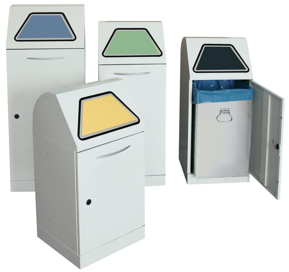 · Aus verzinktem Stahlblech · Geräuschlose Schließung der Einwurfklappe durch Dämpfer · Ergonomischer Griff und Tritthebel aus Edelstahl · Hochwertige Umweltfreundliche Pulverbeschichtung, schlag- und kratzfest · Flügeltür mit Magnetverschluss und Vierkantverriegelung · Niveauregulierung im Frontbereich mittels zwei Stellfüßen · Farbe graualuminium-struktur