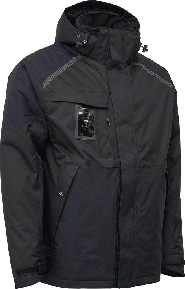 EN 343 Kl. 4/1/X, EN 14058 · mit Stretch · 100% Polyester, ca. 190 g/m² · Wassersäule: > 8000 mm · Nähte getaped · Leichtgewichts-Winterjacke mit hoher Isolierfähigkeit · die Wattierung ist comfortemp® von der Fa. Freudenberg · Brusttasche mit Patte und mit versteckte Ausweis-Tasche · vertikale Brusttasche mit wasserdichtem Reißverschluss · versteckte Innentasche für Tablet/A4-Block · doppelte Wetterschutzleiste mit Klett · 2 Taschen mit Reißverschluss · abnehmbare Kapuze mit Kordel und Klettverstellung · verstellbare Ärmel mit Klettverschluss und Handschutz · verstellbar im Bund · Zugang für Veredelung · wasserdicht