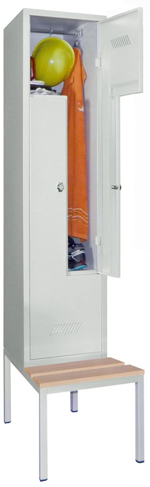 Z-Garderobenschränke auf untergebauter Sitzbank finden überall dort Verwendung, wo der Platz nur für einen Garderobenschrank mit 2 Abteilen übereinander ausreicht, aber trotzdem längere Kleidungsstücke untergebracht werden müssen. · Stabile, verschweißte Stahlblechkonstruktion mit Lüftungsschlitzen in den Türen ∙ Einschlagende Türen mit Verstärkungstaschen und Drehriegelverschluss ∙ Je Abteil 1 Kleiderstange und 3 Kleiderhaken · Untergebaute Sitzbank auf Vierkantrohrgestell, Lackierung RAL 7035 lichtgrau ∙ Füße mit Niveau-Ausgleich ∙ Sitzhöhe 430 mm bei Kunststoffleisten, 420 mm bei Holzleisten