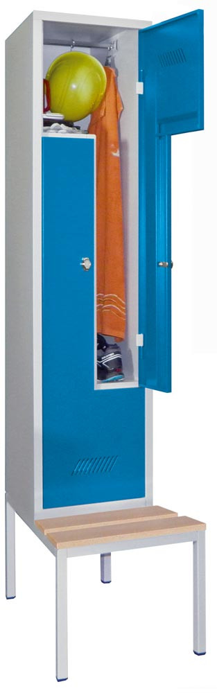 Z-Garderoben, untergeb. Sitzbank, Bucheleiste, 2 Abt., BxTxH 400x500/800x2150 mm, Drehriegel, RAL 7035/5012 E6422602