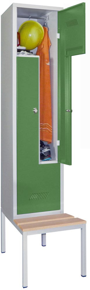 Z-Garderoben, untergeb. Sitzbank, Bucheleiste, 2 Abt., BxTxH 400x500/800x2150 mm, Drehriegel, RAL 7035/6011 E6422603