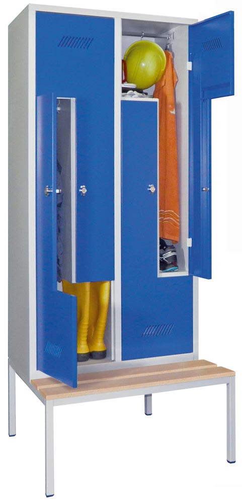 Z-Garderoben, untergeb. Sitzbank, Bucheleiste, 2 Abt., BxTxH 400x500/800x2150 mm, Drehriegel, RAL 7035/5010 E6422601