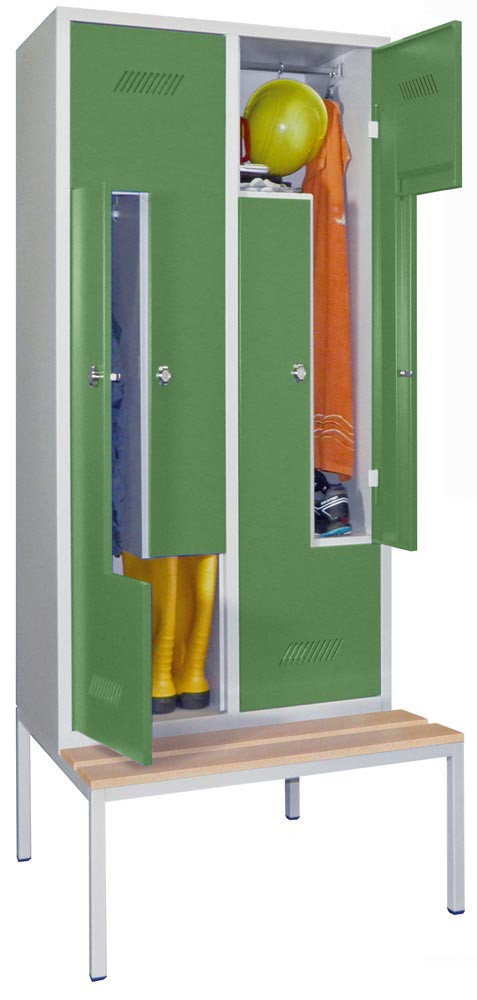 Z-Garderobenschränke auf untergebauter Sitzbank finden überall dort Verwendung, wo der Platz nur für einen Garderobenschrank mit 2 Abteilen übereinander ausreicht, aber trotzdem längere Kleidungsstücke untergebracht werden müssen. · Stabile, verschweißte Stahlblechkonstruktion mit Lüftungsschlitzen in den Türen ∙ Einschlagende Türen mit Verstärkungstaschen und Drehriegelverschluss ∙ Je Abteil 1 Kleiderstange und 3 Kleiderhaken · Untergebaute Sitzbank auf Vierkantrohrgestell, Lackierung RAL 7035 lichtgrau ∙ Füße mit Niveau-Ausgleich ∙ Sitzhöhe 430 mm bei Kunststoffleisten, 420 mm bei Holzleisten