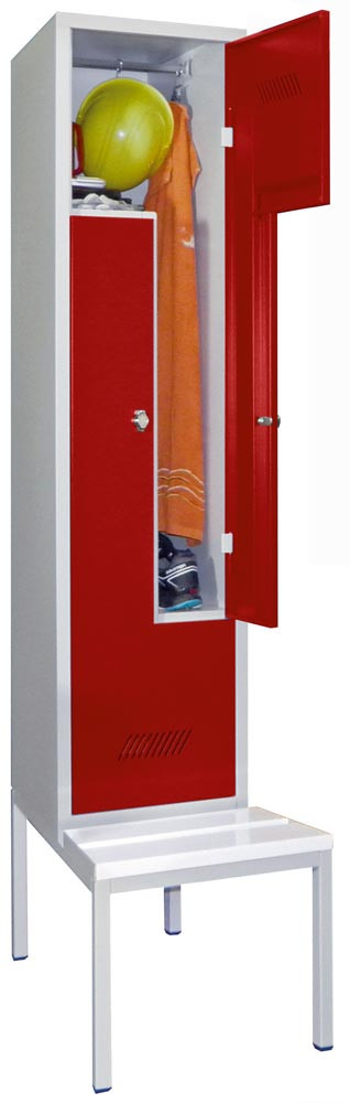 Z-Garderobenschränke auf untergebauter Sitzbank finden überall dort Verwendung, wo der Platz nur für einen Garderobenschrank mit 2 Abteilen übereinander ausreicht, aber trotzdem längere Kleidungsstücke untergebracht werden müssen. · Stabile, verschweißte Stahlblechkonstruktion mit Lüftungsschlitzen in den Türen ∙ Einschlagende Türen mit Verstärkungstaschen und Drehriegelverschluss ∙ Je Abteil 1 Kleiderstange und 3 Kleiderhaken · Untergebaute Sitzbank auf Vierkantrohrgestell, Lackierung RAL 7035 lichtgrau ∙ Füße mit Niveau-Ausgleich ∙ Sitzhöhe 430 mm bei Kunststoffleisten, 420 mm bei Holzleisten