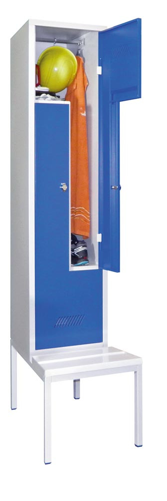 Z-Garderoben, untergeb. Sitzbank Kunststoffleiste, 2 Abteile, BxTxH 400x500/800x2150 mm, Drehriegel, RAL 7035/5010 E6422586