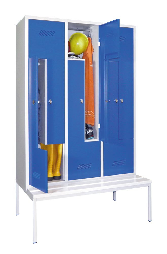 Z-Garderobenschränke auf untergebauter Sitzbank finden überall dort Verwendung, wo der Platz nur für einen Garderobenschrank mit 2 Abteilen übereinander ausreicht, aber trotzdem längere Kleidungsstücke untergebracht werden müssen. · Stabile, verschweißte Stahlblechkonstruktion mit Lüftungsschlitzen in den Türen ∙ Einschlagende Türen mit Verstärkungstaschen und Drehriegelverschluss ∙ Je Abteil 1 Kleiderstange und 3 Kleiderhaken · Untergebaute Sitzbank auf Vierkantrohrgestell, Lackierung RAL 7035 lichtgrau ∙ Füße mit Niveau-Ausgleich ∙ Sitzhöhe 430 mm bei Kunststoffleisten, 420 mm bei Holzleisten