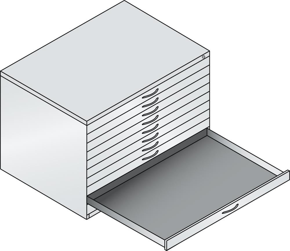∙ Stabile Stahlblechkonstruktion mit hochwertiger Einbrennlackierung ∙ Für Formate DIN A1 bis DIN A0 ∙ Leichtlaufende Schubladen auf Kugelrollenteleskopschienen, vorn mit Niederhalter, hinten mit Deckleiste, lichte Innenhöhe 55 mm ∙ Gelochte Schubladenböden zur Unterteilung ∙ DIN A0 zu 4/5, DIN A1 voll ausziehbar ∙ Geräuscharmes Schließen durch das ESE-System (End-Selbst-Einzug) ∙ Schubladen mit Auszugsperre gegen das gleichzeitige Öffnen von mehreren Schubladen zur Verhinderung der Kippgefahr ∙ Zentral verschließbar durch Sicherheitsschloss mit 2 Schlüsseln ∙ Formschöne, mattverchromte Bügelgriffe ∙ Traglast ca. 40 kg/Schublade ∙ Abdeckplatte, 25 mm stark und Sockel 100 mm hoch, gegen Mehrpreis