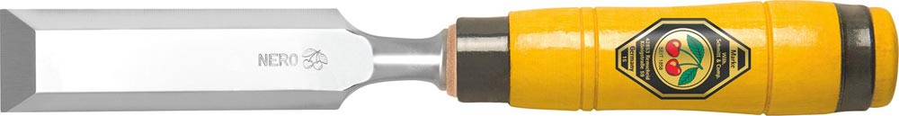 DIN 5141 BHL · hoch kohlenstoffhaltiger Werkzeug-Spezialstahl · halblange, schwere Ausführung · blank geschliffen · mit Seitenfasen und starken, runden, lackierten Weißbuchenheften Ulmer Form · mit 2 Stahlzwingen und Lederscheibe