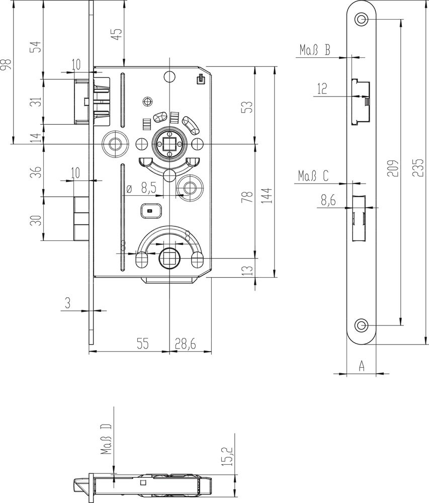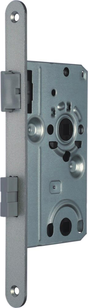 BAD Ausführung · nach DIN 18251-1 Klasse 2 · allseitig geschlossener Schlosskasten · 1-tourig · abgerundet · Stulp silber · Stulplänge 235 mm · Dornmaß 55 mm · Entfernung 78 mm · Vierkant 8 mm · Falle und Riegel aus Metall · ohne Schließblech