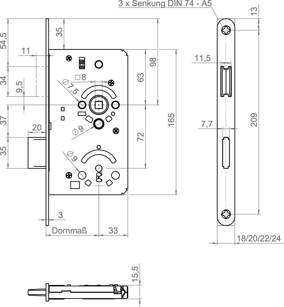 BB-Ausführung · Einsteckschloss mit Magnetfalle · Falle ist bei geöffneter Tür bündig mit Stulp · im geschlossenen Zustand der Tür fällt die Falle durch einen Magneten ins Schließblech · geräuscharme Schließung · Klemmnuss aus Stahl, verzinkt · Nusslager aus Polyamid · Falle aus Kunststoff, schwarz · Riegel 2-tourig aus Stahl · Riegelkopf aus Guss vernickelt · Im Lieferumfang je nach Stulpbreite enthalten: