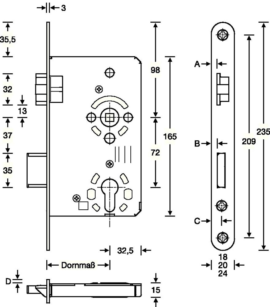 PZW Ausführung · nach DIN 18251-1 Klasse 3 · allseitig geschlossener Schlosskasten · 2-tourig · mit Wechsel · abgerundet · Stulplänge 235 mm · Entfernung 72 mm · Vierkant 8 mm · Falle und Riegel aus Zinkdruckguss · Falle mit Geräuschdämpfung · ohne Schließblech