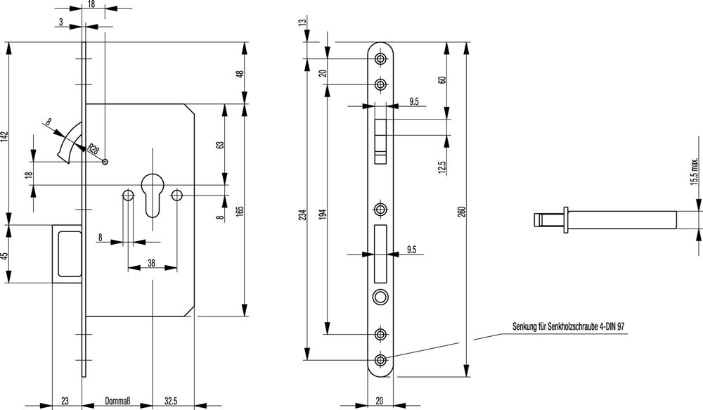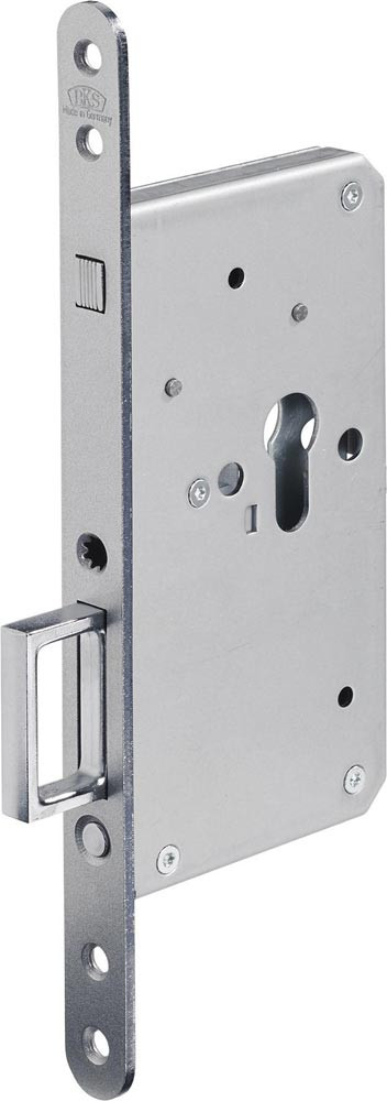 Schiebetürschloss mit Springgriff und Auslöseknopf · allseitig geschlossener Schlosskasten · Stulplänge 260 mm · Dornmaß 55 mm · DIN links / rechts verwendbar · PZ · mit Zirkelriegel verchromt · ohne Schließblech